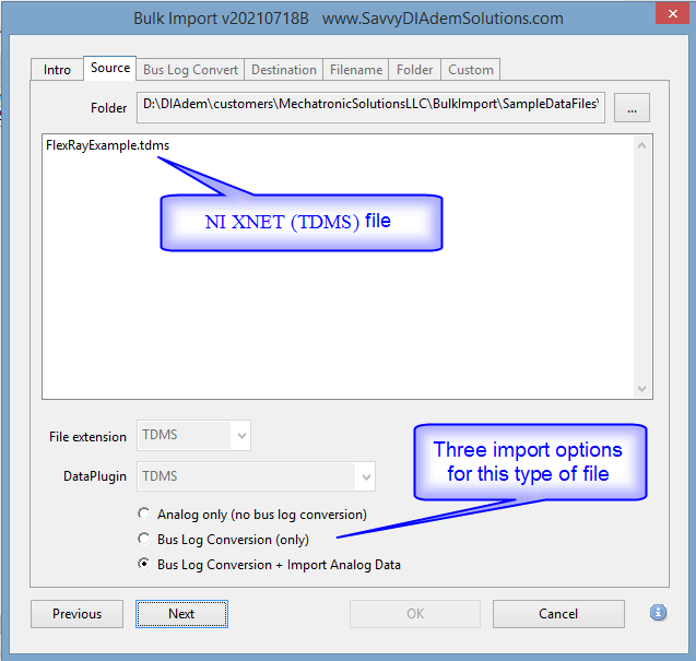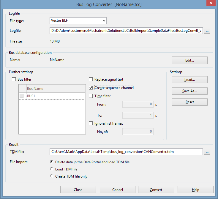 Below is a comparison of bus log conversion using Bulk Import versus DIAdem's Bus Log Converter. DIAdem's Bus Log Converter is a necessary and full featured tool for bus log conversion. However, many bus log conversion tasks may be expedited using Bulk Import.