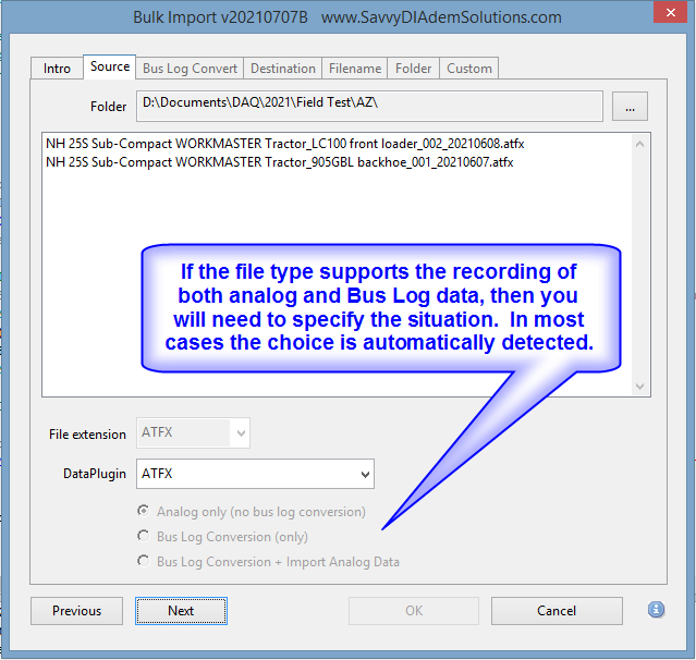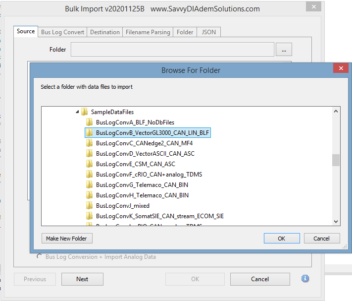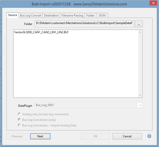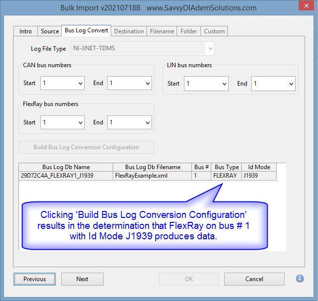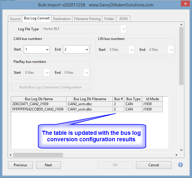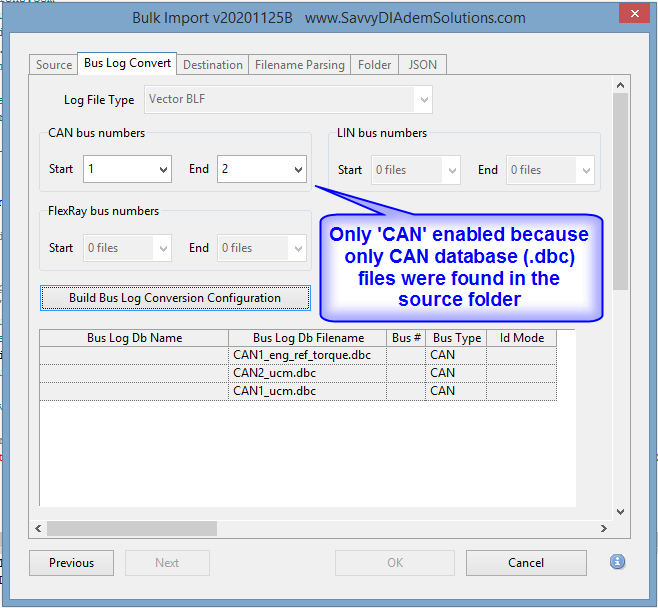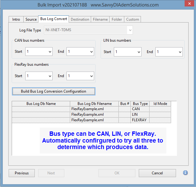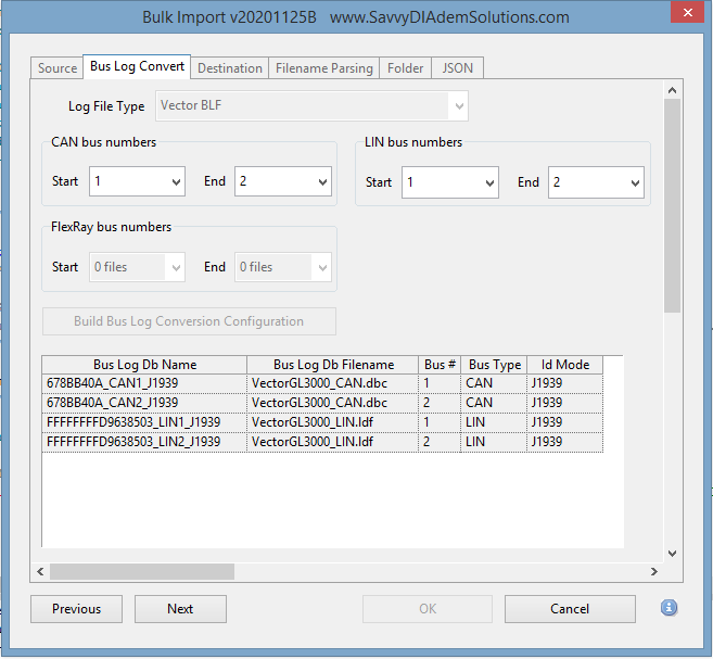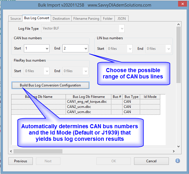 Bus Log Conversion is dramatically simplified by using Bulk Import. Bulk Import will scan the CAN/LIN/FlexRay bus numbers and identify those that yield Bus Log data. It will also determine the ID Mode (J1939 or Default) that produces the best conversion results. See Bulk Import vs Bus Log Converter for a detail comparison by example. The screen images below demonstrate how easy Bulk Import is to use to accomplish Bus Log Conversion.