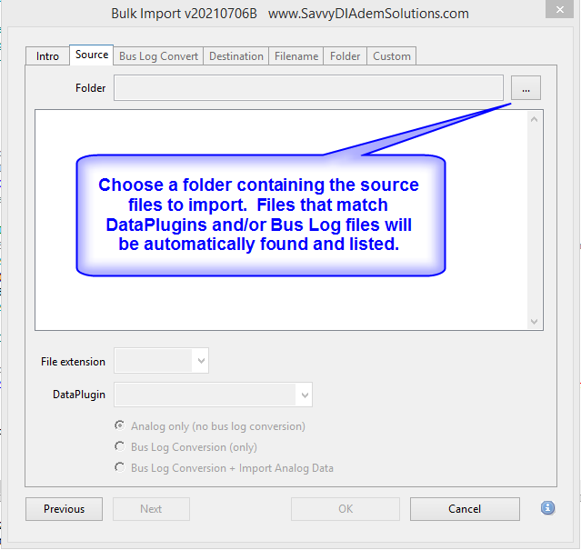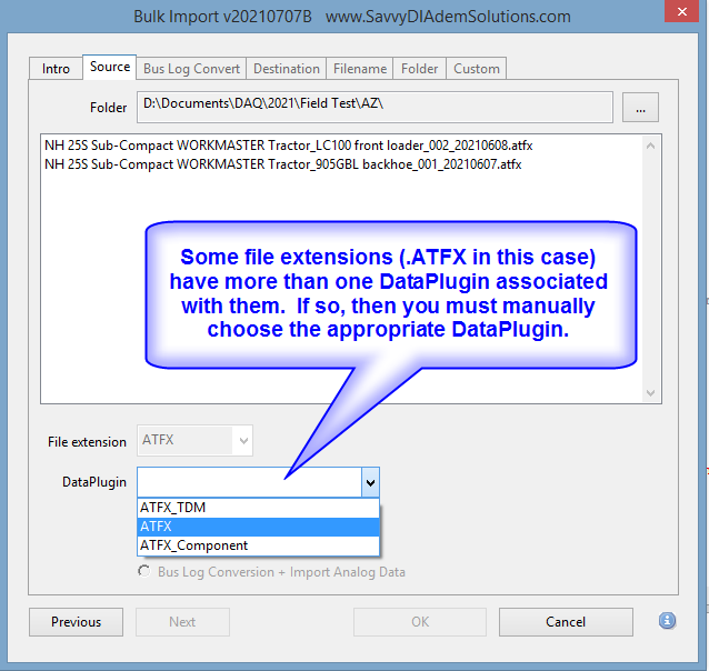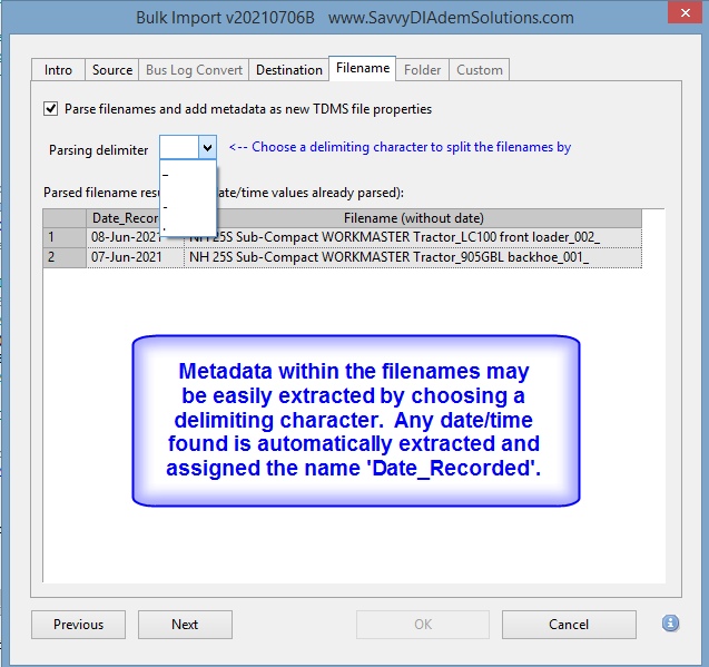 Bulk Import allows you to import multiple data files and add metadata to them as a group (batch). You may import data files that require a DataPlugin and/or DIAdem's Bus Log Converter. Metadata is added to the data files from the filename(s), and/or the path, and/or Custom key/value pairs. Adding metadata to your files is important because it allows you to categorize and identify your data files later.