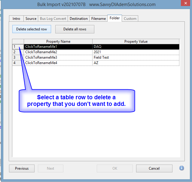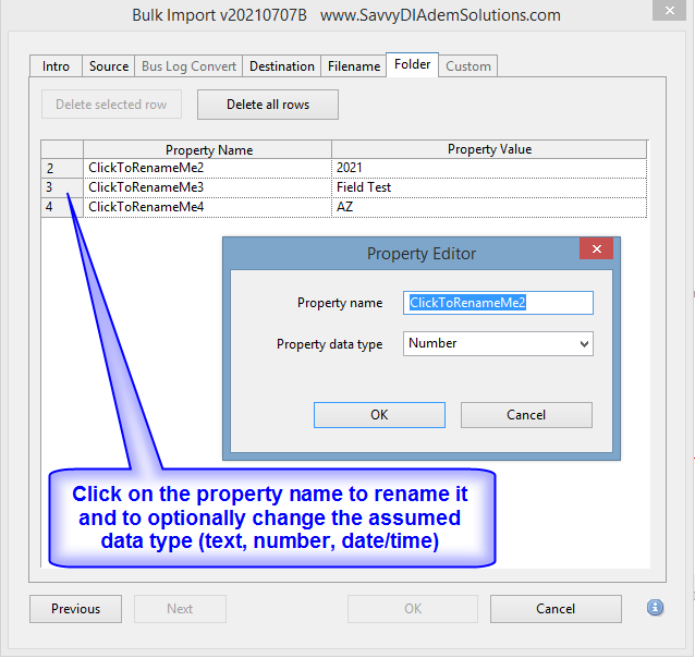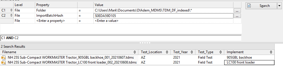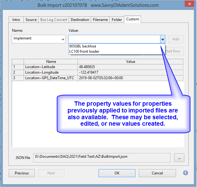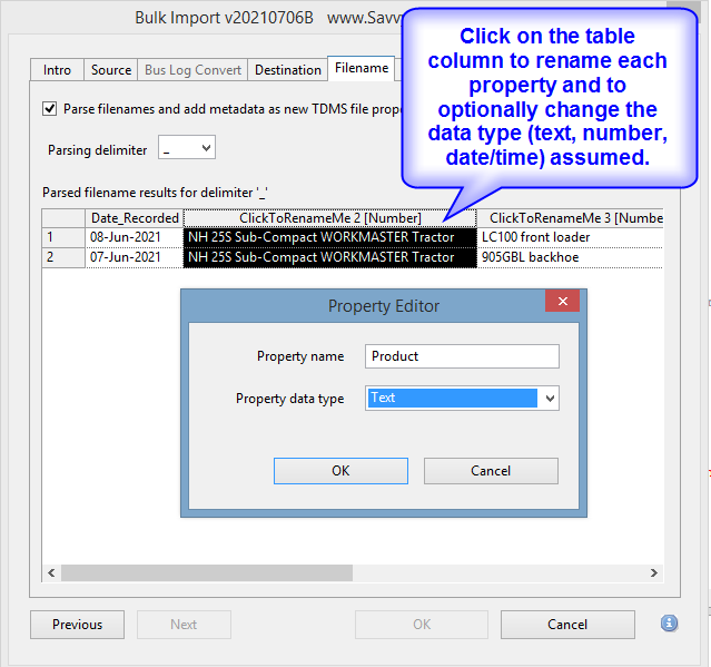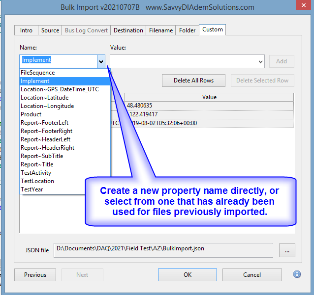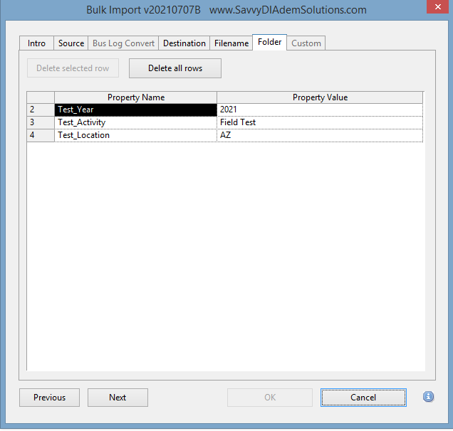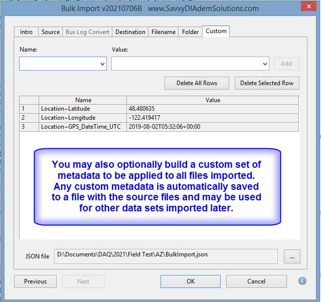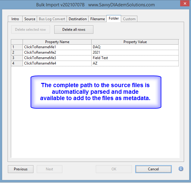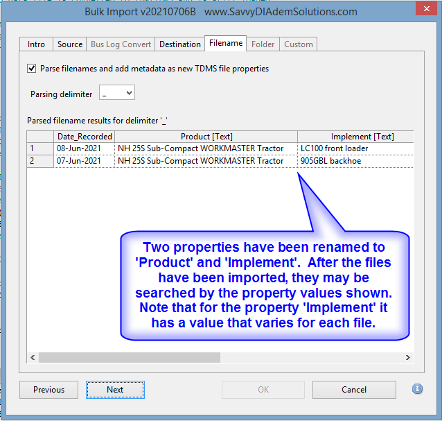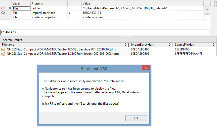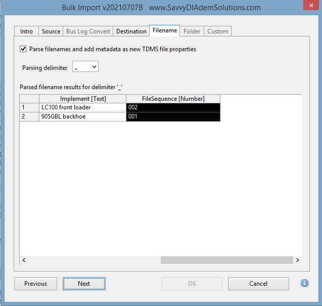The optional Custom metadata list you build is saved to a JSON file in the same folder as the data and can be used for subsequent data sets you wish to Bulk Import. Each file is imported using a independent instance of DIAdem (worker), so that any issues during the import process will only impact that single file in the batch. A unique hash named 'SourceFileHash' is calculated on the raw data files and automatically added as a file property to each imported data file.