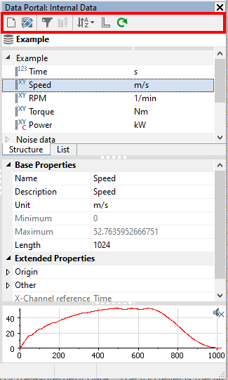 The Data Portal enables you to visualize and interact with the content of a TDMS/TDM data file. If the Data Portal is not shown, the keys 'Alt-Ft' or choosing the menu 'Window' 'Data Portal' from any panel will show the Data Portal.