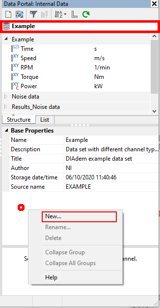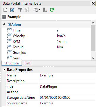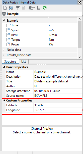 The Data Portal has two tabs named 'Structure' and 'List'. The 'Structure' tab should be selected, as it is the more intuitive way of viewing the contents of Data Portal. Below the 'Structure' and 'List' tabs, is a section that shows the file/root, channel group, or channel properties. Clicking on the file at the top will show the file/root properties. Clicking on a channel group will show the channel group properties. Clicking on a channel will show the channel properties.