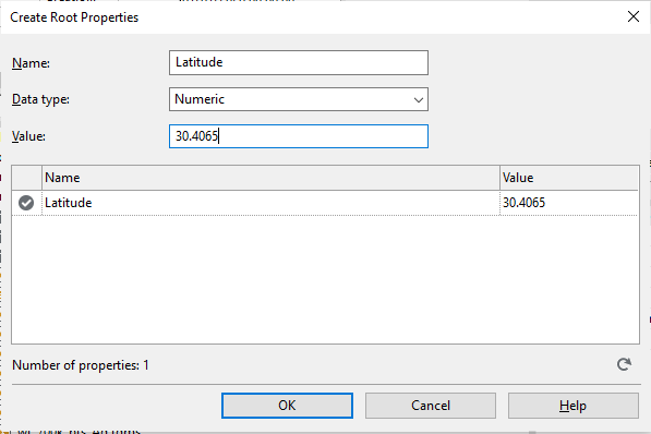 The 'Create Root Properties' dialog will appear. Assign "Latitude" to the 'Name:', select 'Numeric' for the 'Data type', and assign the value of "30.4065" to the 'Value:' field. Click the 'OK' button when finished.