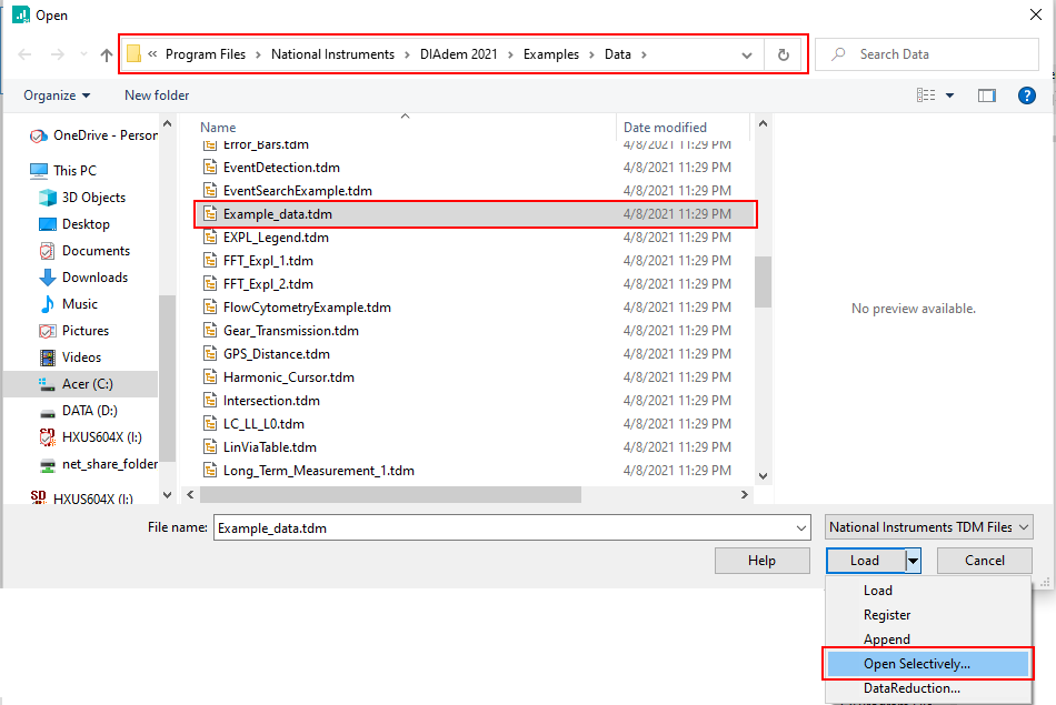 Before starting this tutorial, use Windows file explorer to locate the file 'C:\Users\Public\Documents\National Instruments\DIAdem ####\Data\Example.xls' DO NOT LOAD THIS FILE WITH EXCEL OR ANY OTHER APPLICATION (that will prevent NI DIAdem from loading it).