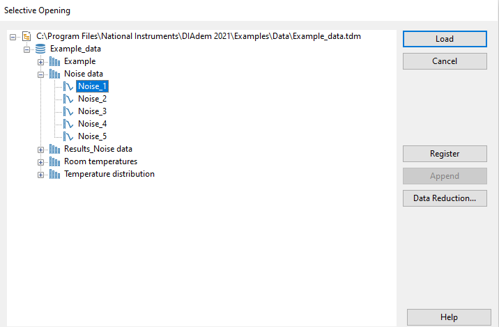 Clear the Data Portal. Selectively load the channel 'Noise data/Noise_1' from the DIAdem example file 'Example_data.tdm' located in the folder 'C:\Program Files\National Instruments\DIAdem ####\Examples\Data\'. From the NAVIGATOR panel, choose 'File', 'New' to clear the Data Portal. Then choose 'File', 'Open...' and the 'Open' dialog will appear. Navigate to the folder 'C:\Program Files\National Instruments\DIAdem ####\Examples\Data\'. Change the file filter at the bottom to 'National Instruments TDM Files'. In the list of files, select the file 'Example_data.tdm'. At the bottom right of the dialog, click on the dropdownbox at the 'Load' button and choose 'Open Selectively...'.
