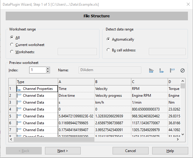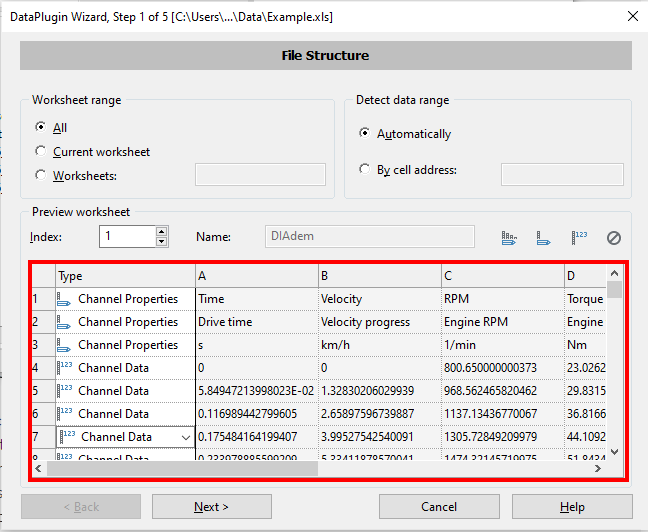 From the NAVIGATOR panel, click on the 'File' menu and choose the option 'Excel DataPlugin Wizard...'. A file selection dialog will appear. Find the file 'Example.xls' and click on the 'Open' button. The DataPlugin Wizard dialog will appear, and Step 1 'File Structure' will appear as shown below. Notice that in this Excel sheet, the first two rows consist of heading names for the column, the third row is the units, and the data begins in the fourth row. The first column is labeled 'Type' and consists of a drop down combo box where you can set the type of row as 'Group Properties', 'Channel Properties', 'Channel Data' or 'Ignore'.