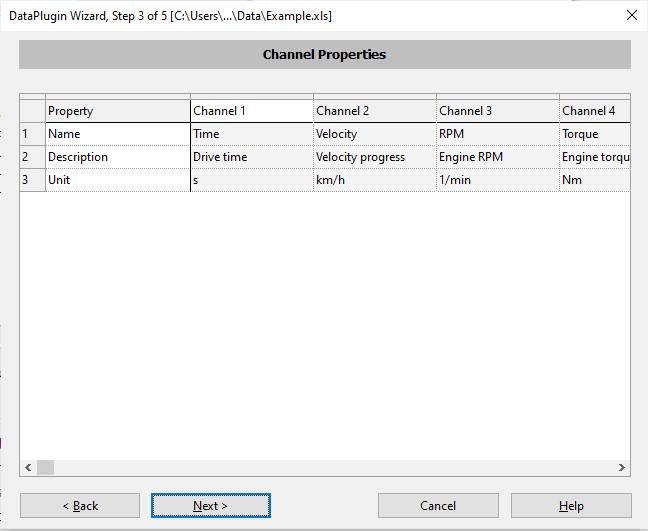 In Step 3 'Channel Properties', DIAdem has correctly assumed that the first row is the channel name, the second row should be the channel property named 'Description', and the third row the channel unit. Click the 'Next >' button at the bottom of the dialog to continue.