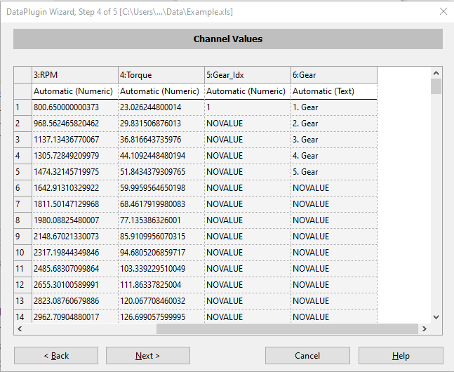 In Step 4 'Channel Values', you assign the data type for the channel data by column, by changing the value of the drop down combo box in the second unlabeled row from the top. It is very important to review all columns and insure the correct data type (numeric, text, time or date/time) is selected. DIAdem will make an assumption on the data type, and the combo box choice will be 'Automatic' followed by the data type in parenthesis (data type). Note that in the 5th column labeled 'Gear_Idx', row #1 has a value of 1, and the remaining values are NOVALUE. This is because a blank value is in that cell from row 2 onward. This is the correct setting. Similarly, in the 6th column labeled 'Gear', the default data type will be text or 'Automatic (Text)', and the first five values will be the text value 'Gear', followed by NOVALUE for the remaining rows. Click the 'Next >' button at the bottom of the dialog to continue.