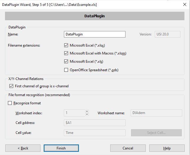In the final Step 5 'DataPlugin', you may create a unique name for the DataPlugin you are creating. It is strongly suggested you include the text 'Excel' in the name, and anything else that will help you know when this DataPlugin should be applied to any future files you wish to import.