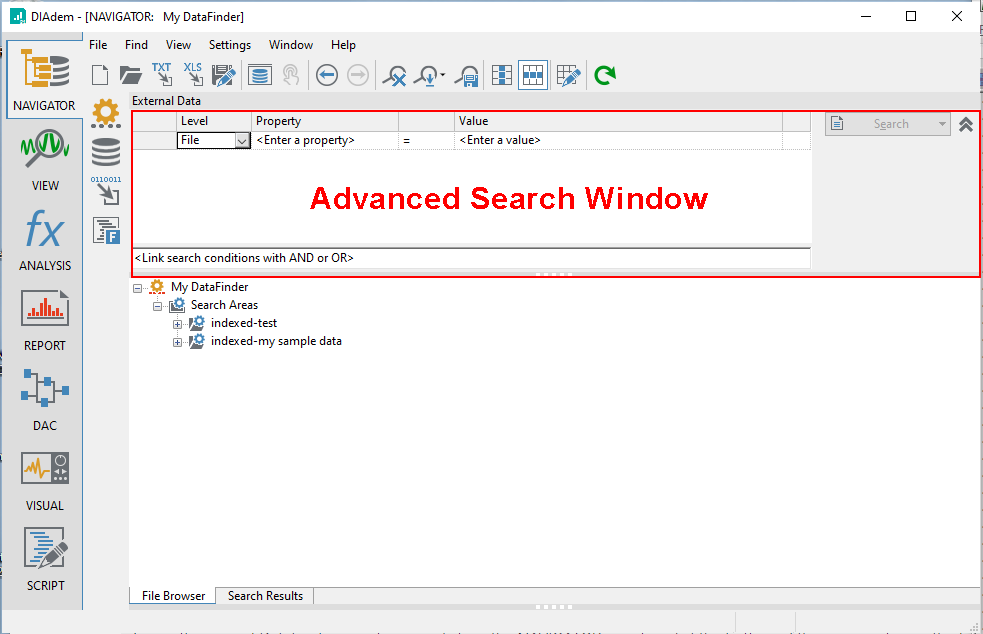 From the NAVIGATOR panel, click on the 'File Browser' tab at the bottom of the screen. Configure DIAdem to perform an advanced search by choosing the menu option 'Find', 'Advanced Search'. Clear out any existing search by choosing the menu option 'Find', 'Delete Query'. Your DIAdem application should appear approximately like what is shown below.