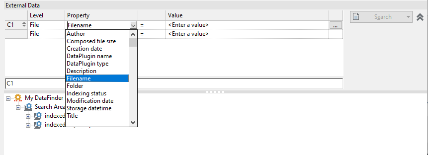 At the top of the Advanced Search Window are three tabular columns labeled 'Level', 'Property', and 'Value'. The 'Level' column is where you specify the source of the property to search for, such as the 'File', 'Channel Group' or 'Channel'. In the first row (not the header), select 'File' under the 'Level' column for a file/root property. Under the 'Property' column, in the first row click in the '<enter a property>' combo box, and available file/root properties by name will appear in the list. Choose the 'Fielname' property. NOTE: Filename, channel group name, channel name and other DIAdem standard properties such as 'folder' and channel 'units' are presented and treated just like custom properties in the user interface.