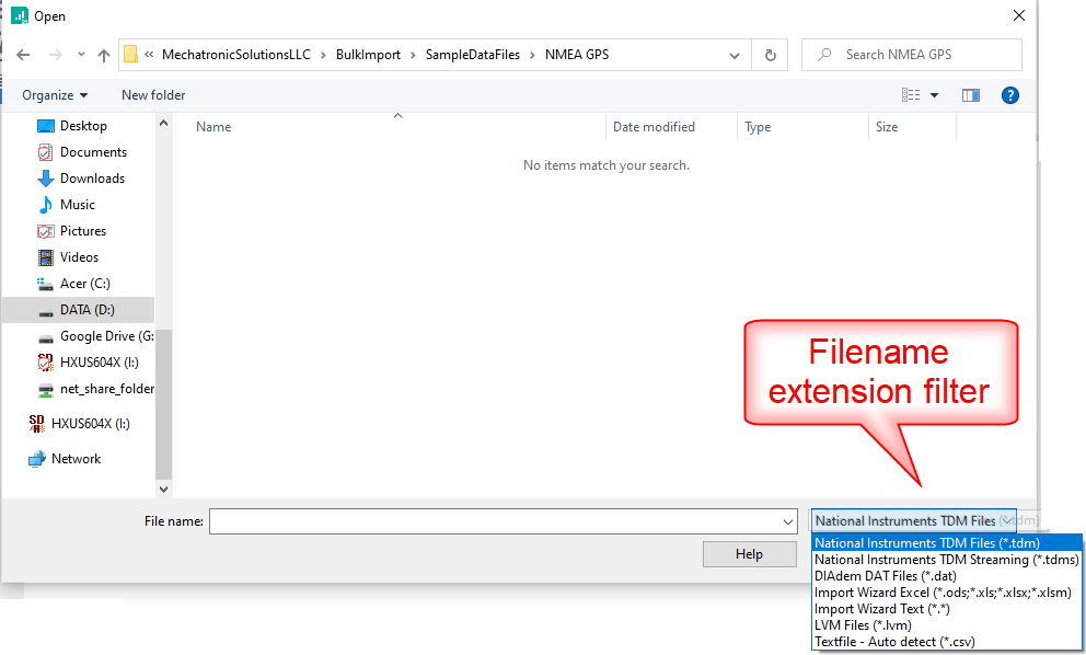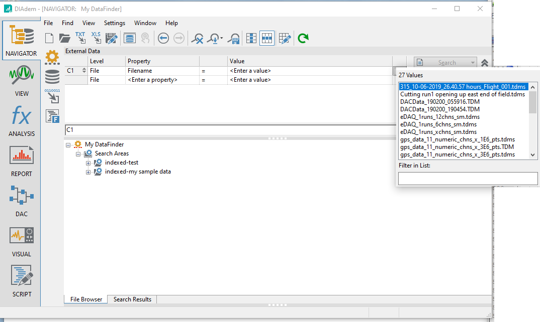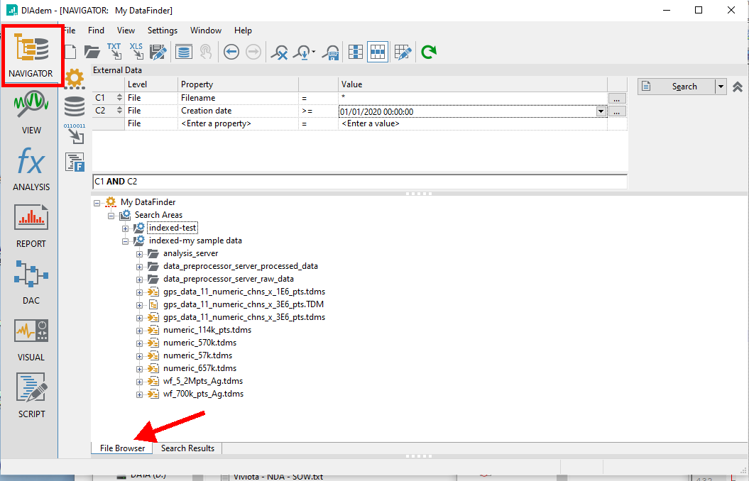 DIAdem works most efficiently when raw data is imported, converted to the TDM Model, and then saved to a TDMS (.tdms) binary file in a DataFinder indexed search area. You can browse files in a search area by clicking on the NAVIGATOR panel, and then at the bottom of the custom NAVIGATOR user interface, clicking on the 'File Browser' tab.