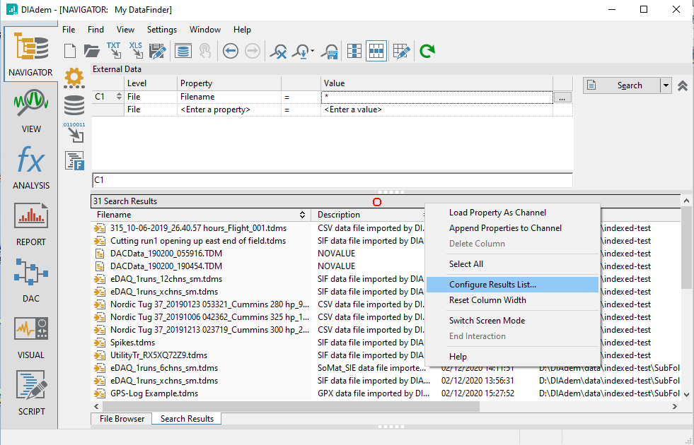 In the upper right of the Advanced Search Window, click the 'Search' button. This will cause the 'Search Results' tab at the bottom to be activated, and then any search results will be displayed. When searching by files (DIAdem calls this 'Results as Elements'), the 'Filename' will always appear, and then other properties from the files may appear in additional columns. You can configure what additional properties from the files are shown by right clicking on the bar above the column titles and choosing 'Configure Results List...' from the pop up menu. This will cause the 'Configure Search Results List' dialog to appear. The use of this dialog is self explanatory.