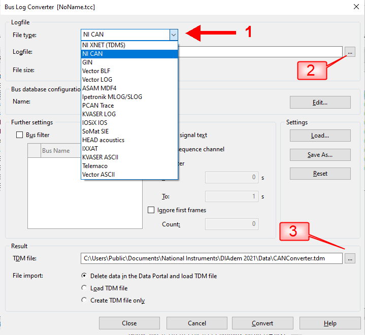 From the NAVIGATOR panel, click on the 'File' menu and select 'Open Bus Log Converter...". Choose the file type (1) from the drop down box. Identify the bus log file (2) to be converted. Specify the output TDM filename and location at (3).