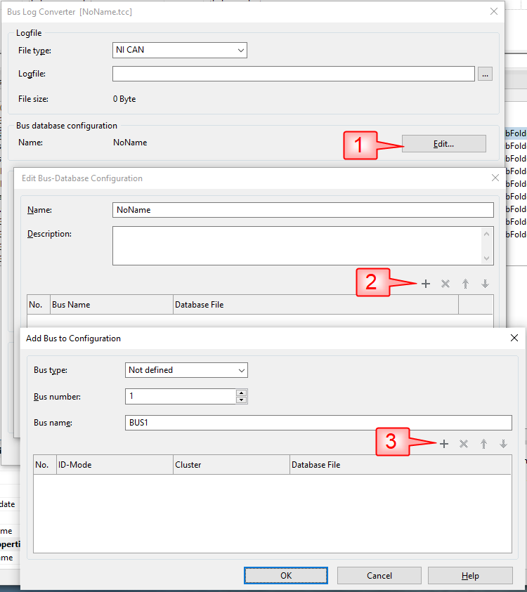 Next click on the 'Edit...' button (1) in the 'Bus database configuration' area. Click on the '+' (2) button in the Edit Bus Database Configuration dialog. Click on the '+' (3) button in the 'Add Bus to Configuration' dialog and select a bus log database file. Then configure the 'Bus type' from the drop down box, and then the 'Bus number'.