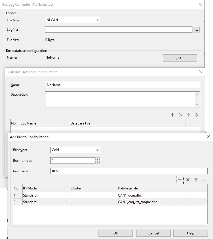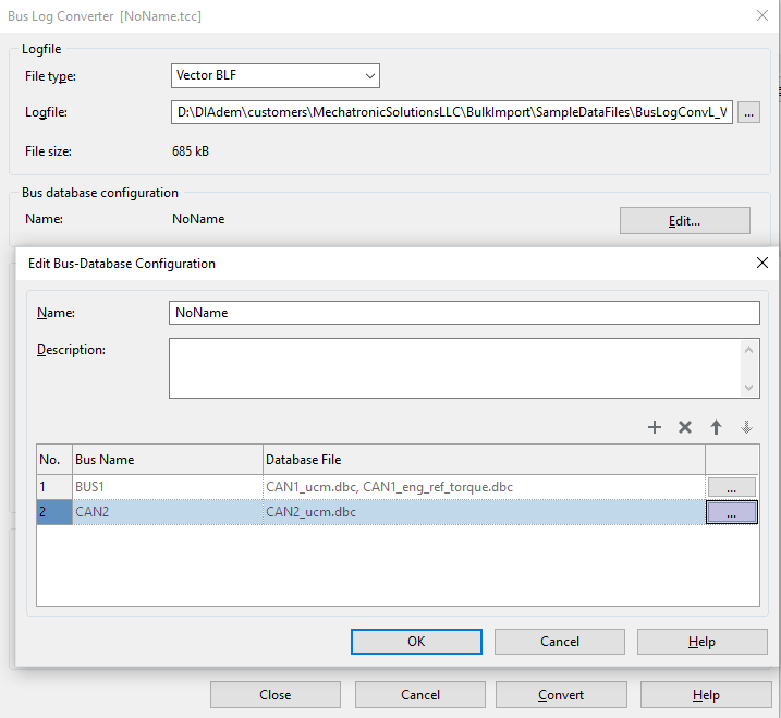 If another bus number exists, click on the '+' button in the 'Edit Bus Database Configuration' dialog and repeat the prior process for the additional bus number. In the image below, you can see one additional CAN bus log file was configured for bus #2 (Bus Name = CAN2) as the second item in the 'Edit Bus Database Configuration' dialog list. When done, click on the 'Edit Bus Database Configuration' 'OK' button in the dialog.