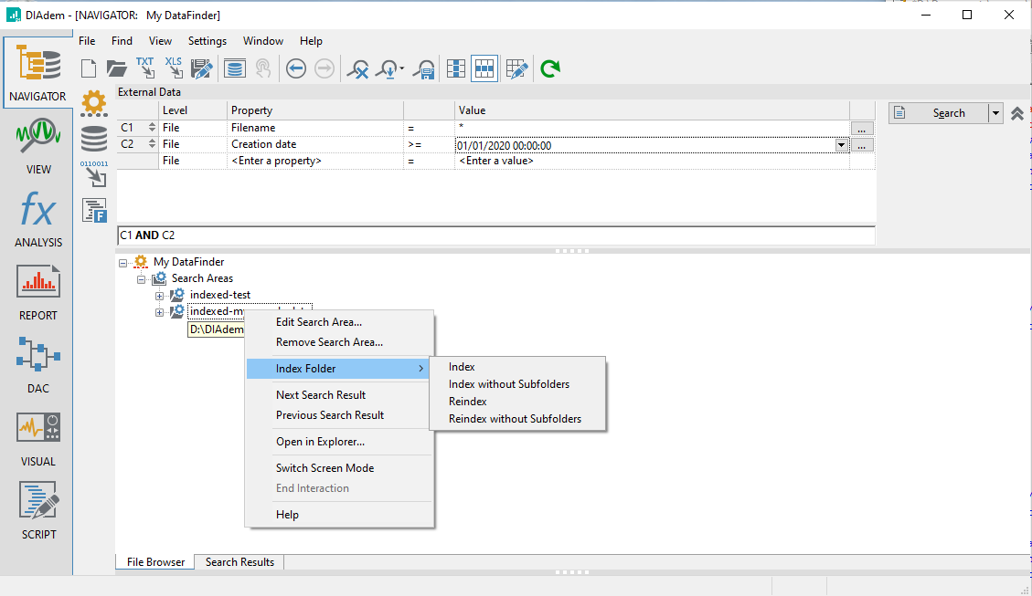 To see the current DataFinder search areas, click on the NAVIGATOR panel, and at the bottom of the screen, choose the tab labeled 'File Browser'. By right clicking on 'Search Areas', you may add a new search area. IMPORTANT: All imported data saved to TDMS files (.tdms) should be stored on a fast drive that is locally connected to the PC running DIAdem. This will provide you with the best performance. To remove a search area, right click on a search area listed below 'Search Areas' and choose the 'Remove Search Area...' option. After adding and/or removing search areas, you should re-index the DataFinder by selecting the NAVIGATOR menu options 'Settings', 'My DataFinder', 'Configure...'. In the 'Configure My DataFinder' dialog, click on the 'Indexer' tab and then click the 'Start Now' button.