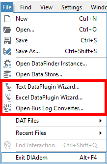 DIAdem supports reading measurement data from many different file formats, including binary, text/CSV, and bus log data. DataPlugins are used to read binary and text/CSV files. The Bus Log Converter is used to read CAN, LIN, and FlexRay bus log data. You can easily use the TXT Wizard to create a custom DIAdem DataPlugin for reading text or CSV data files. In addition to the many binary file types included with a DIAdem installation, you can also visit DIAdem's website online to download a DataPlugin for hundreds of different data acquisition file types.