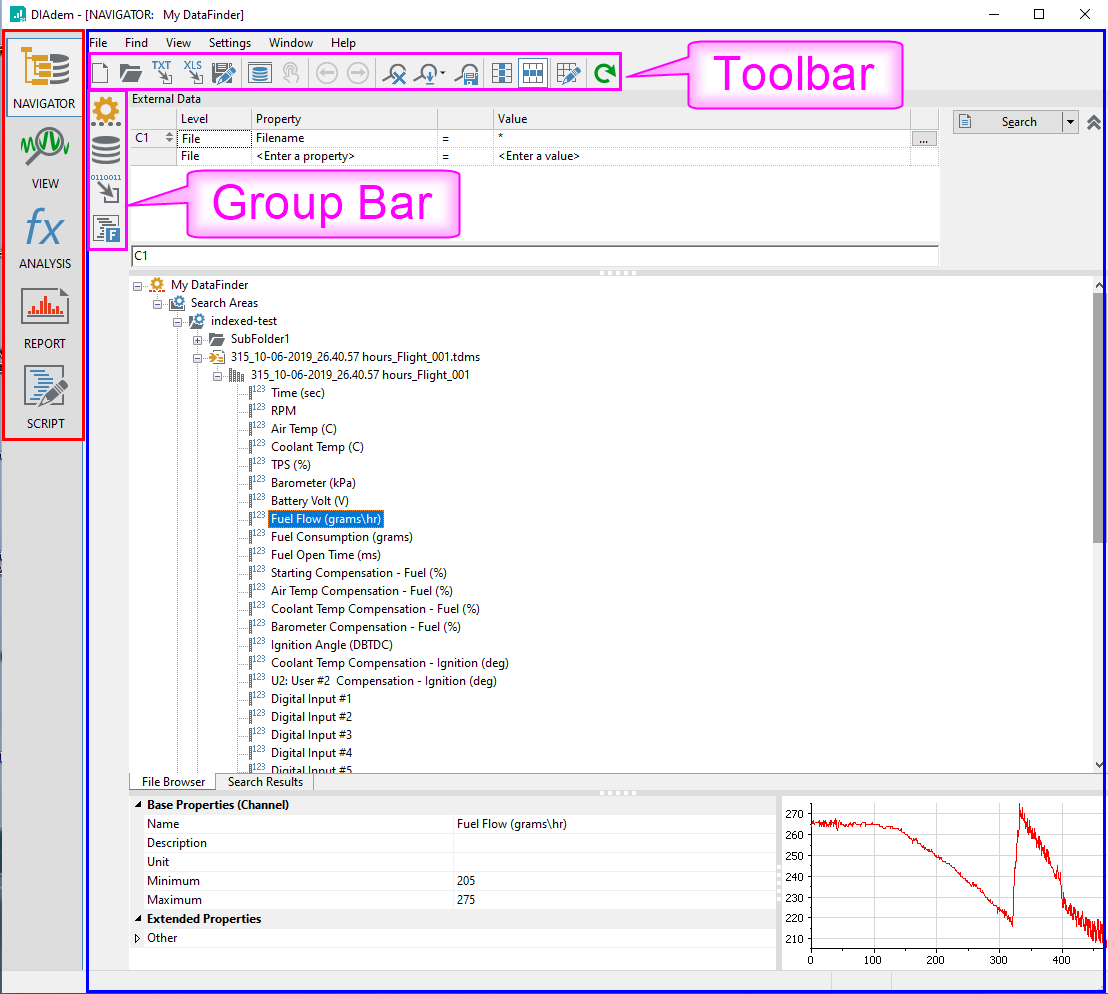 The DIAdem graphical user interface (GUI) is organized by task. The Navigator panel allows you to import raw data, connect to an indexing service such as DataFinder, and to search for data. The Data Portal provides a means to interact with imported data that has been loaded into memory. The View panel has tools to enable you to visually analyze and interact with data loaded into the Data Portal. The Analysis panel provides hundreds of engineering and scientific analysis functions for the manipulation, calculation, and analysis of data. The Report panel has a powerful user interface that quickly generates custom visualizations of the analyzed data, and supports exporting report pages to common external document formats. The Script panel allows you to automate repetitive tasks.