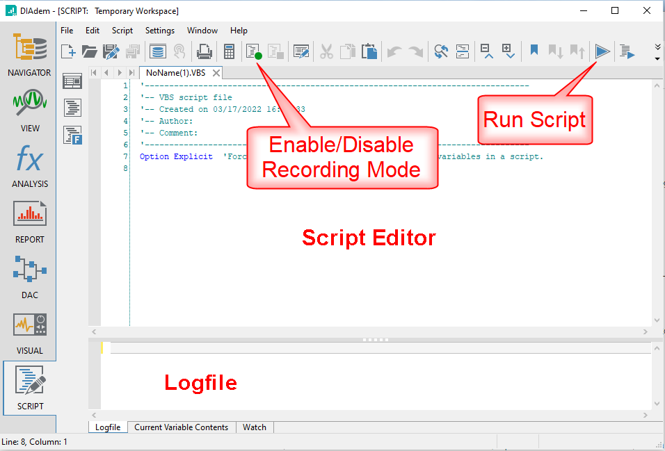This tutorial will teach you how to use the SCRIPT Recording Mode to record a series of actions in DIAdem. Then you will use the 'VBScript Template' provided and adapt that script with the contents from the recording mode script. For this tutorial, be prepared to find the example file that comes with the DIAdem installation named 'Example.tdm' located in 'C:\PROGRAM FILES\NATIONAL INSTRUMENTS\DIADEM 2021\Libr\Data\Example.tdm' and load only the 'Time', 'RPM', and 'Torque' channels using the SCRIPT commands:Call Data.Root.Clear() 'NOTE: Revise the #### with the DIAdem version you have (e.g. 2021) Call DataFileLoadSel("C:\PROGRAM FILES\NATIONAL INSTRUMENTS\DIADEM ####\Libr\Data\Example.tdm","TDM","[1]/[1]|[1]/[3]|[1]/[4]","Load|ChnXYRelation")
