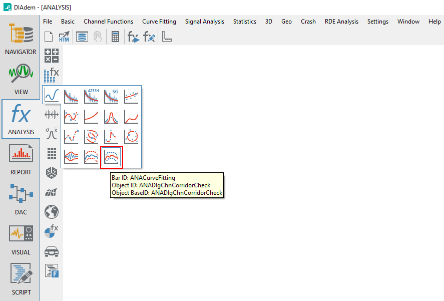 The VBScript below may be used as a template for processing a file loaded in the Data Portal, or each file specified by the NAVIGATOR search results. In either case, the function bProcessDataPortal() is called, input channels are identified, and a DIAdem ANALYSIS function is performed. If the NAVIGATOR search results are being processed, then the file will be saved before the next file from the search results is processed.