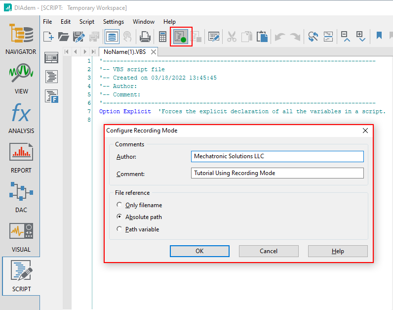 DIAdem's SCRIPT recording mode will record all commands and most variables as you perform a task with any of the non-SCRIPT panels. Access the recording mode by clicking on it from the SCRIPT toolbar. You will need to make a choice on how to handle file references. The 'File reference' option in the dialog of 'Absolute path' is the easiest option for a beginner to understand. The 'Path variable' option will configure an array for the filenames used throughout the script, but you need to be comfortable with VBScript arrays if you want to use that option.