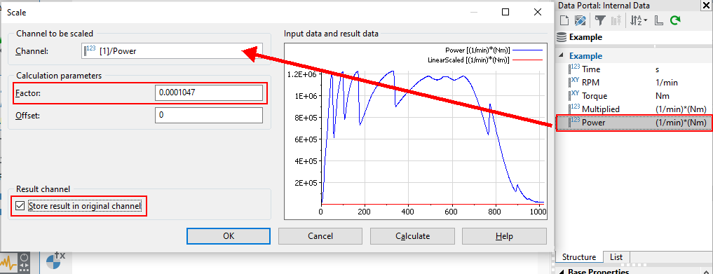 Edit the script as shown above and try running the script (Ctrl-F5). The revised script will create a channel named 'Power'. Note that the unit for power is '(1/min)*(Nm)', and we want kW. The unit needs to be converted, and the ChMult() function doesn't support quantity-based calculations like other commands such as Calculate(). We will fix that by using another ANALYSIS function named 'Scale'. The recording mode should still be on. Click on the ANALYSIS panel and then select the menu 'Basic' and 'Scale...'. In the Data Portal, select the new channel 'Power' and drag and drop it into the 'Scale' dialog channel control labeled 'Channel:'. The 'Factor' in the dialog multiplies the channel values by a constant, and the 'Offset' adds or subtracts and offset from the channel values. (sort of like Y = mX + b). We need to multiply all of the values in Power by '3.142 * 2 * (1/60) * (1/1000) = 0.0001047' in order to express the power channel in units of kW. Enter the constant of '0.37704' into the 'Factor' text box, check the checkbox labeled 'Store result in original channel'. Click the 'Calculate' button, and then the 'Close' button.