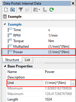 The unit for the channel 'Power' in incorrect. In the Data Portal, click on the channel 'Power', and then in the channel properties window, find 'Unit', click on the unit value, and a '...' button will appear. Click on the '...' button to edit the unit for power.