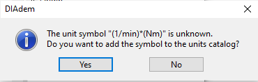 Activate the SCRIPT panel and review the script commands added. No additional commands were added to the script for the unit conversion. If you had said 'Yes' to the earlier dialog, then you would have had to first define what the unit '(1/min)*(Nm)' means in terms of the unit catalog's base value of watts. The only way to fix the units for the channel 'Power' using a script is to use the following script: