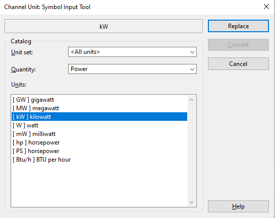 The 'Channel Unit: Symbol Input Tool' dialog will appear. Click on the drop down box to the right of 'Quantity:' and select 'Power'. Under the list box 'Units', select '[kW]kilowatt'. Click the 'Replace' button, and the dialog will close, and the units for the channel 'Power' will be updated to kW.