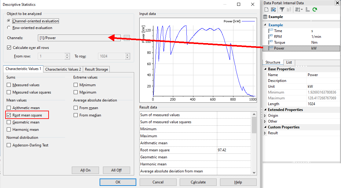 The final step will be to calculate descriptive statistics on the channel 'Power'. With the recording mode still on, activate the 'ANALYSIS' panel. Choose the ANALYSIS menu 'Statistics', 'Descriptive statistics...'. In the Data Portal, select the channel 'Power' and then drag and drop it to the 'Descriptive Statistics' dialog, into the channel control to the right of the label 'Channels:'. Configure the 'Characteristic Values 1' tab to have only the following check boxes checked: 'Root mean square'. Click on the 'Result Storage' tab and insure the checkbox 'Store results in channels' is not checked. Now use the key sequence 'Ctrl-Shift-C' to copy the dialog settings to the Windows clipboard. Click the 'Calculate' button, and then the 'Close' button.
