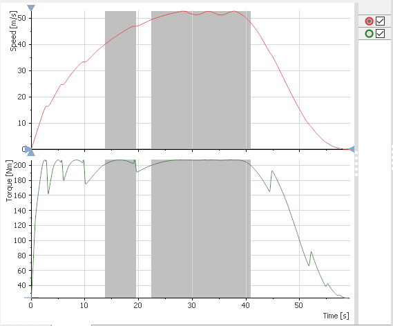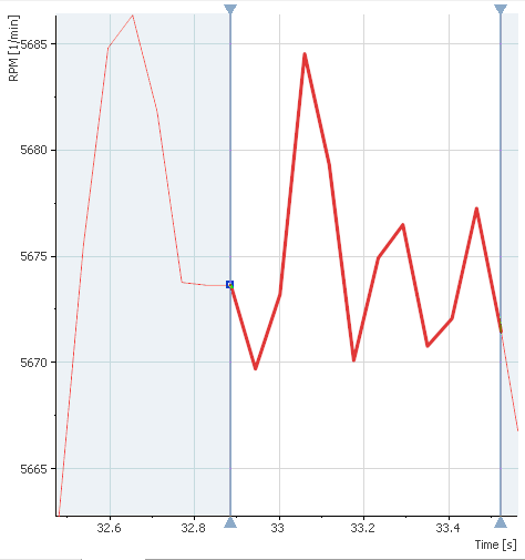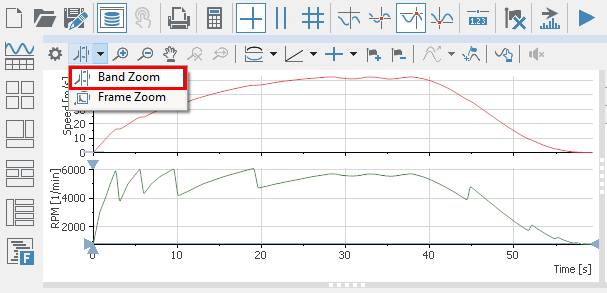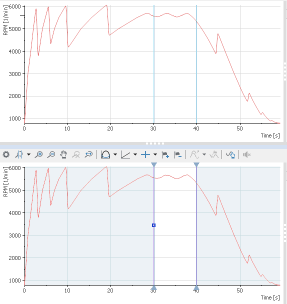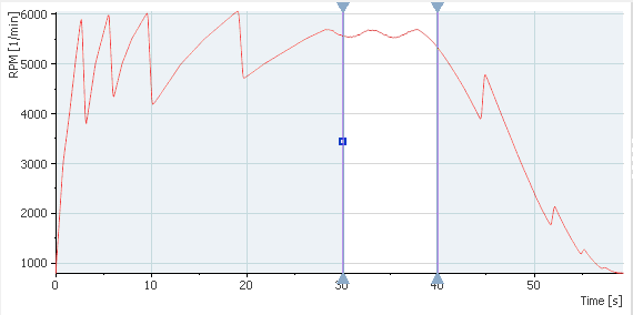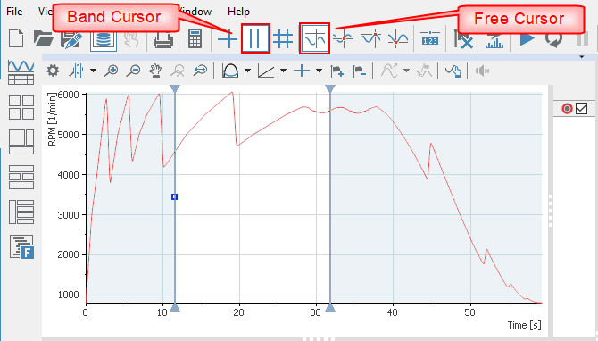 In the Data Portal, expand the channel group 'Example', and then select the channel 'Time' first, and then the channel 'RPM'. Drag and drop the two selected channels into the VIEW sheet upper area, and then choose the '2D Axis System' from the popup menu that appears. Activate the VIEW toolbar 'Free Cursor'. Activate the VIEW toolbar 'Band Cursor'. The 'Band Cursor' will appear as two vertical lines, with the area on either side of the lines shaded. The left band cursor line will have a small blue square in the vertical center of the line. Hover your mouse over each line, and observe how the mouse cursor changes from a four-way arrow cursor, to a two-way left/right cursor. A popup information box will appear as well, showing you the coordinates of the band cursor line. With your mouse over the band cursor line and the mouse cursor appearing as a two-way left/right arrow cursor, click and hold the left mouse button on line, and then move the lines individually to approximately the positions shown in the image below.