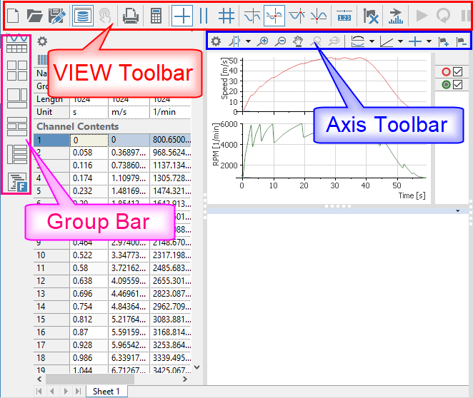 Activate the VIEW panel and create a new layout with the 'File', 'New' menu options. Choose the 'Regular Worksheet Partitions' group bar and then the option 'Four Areas'. In the Data Portal, expand the channel group 'Example', and then select the channel 'Time' first, and then the channels 'Speed' and 'RPM'. Drag and drop the three selected channels into every the VIEW sheet upper left area, and then choose the '2D Axis System' from the popup menu that appears. Repeat this for the remaining three VIEW sheet areas.
