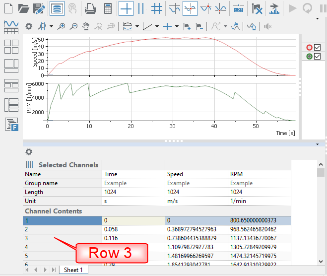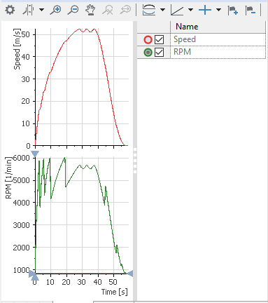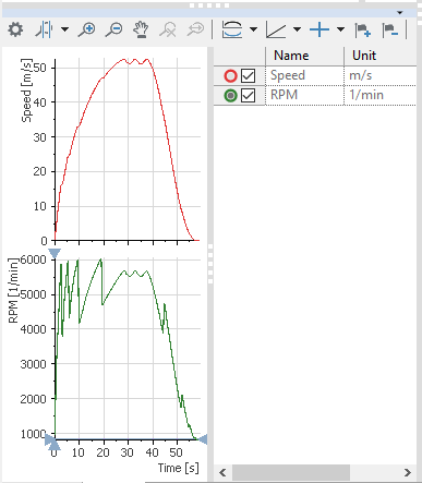 The 'Speed' channel is the red curve, and it cannot be seen because it's amplitude is far less than the 'RPM' green curve. To make them both visible, go to the 2D Axis System toolbar 'Y-Axis' and select the option 'n Systems [linear]'.