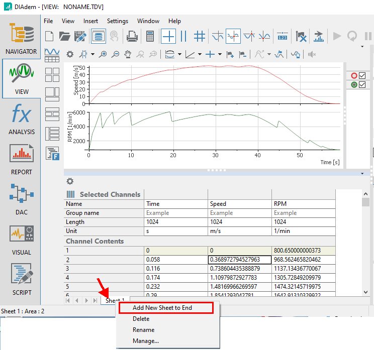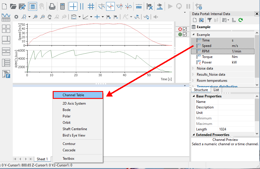 In the Data Portal, select the channels 'Time', 'Speed', and 'RPM' from within the channel group 'Example' and then drag and drop into the VIEW sheet lower area. Choose the 'Channel Table' option from the pop up menu.