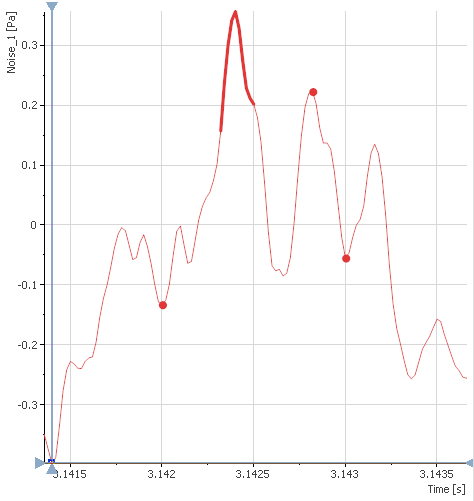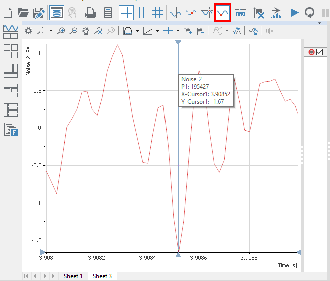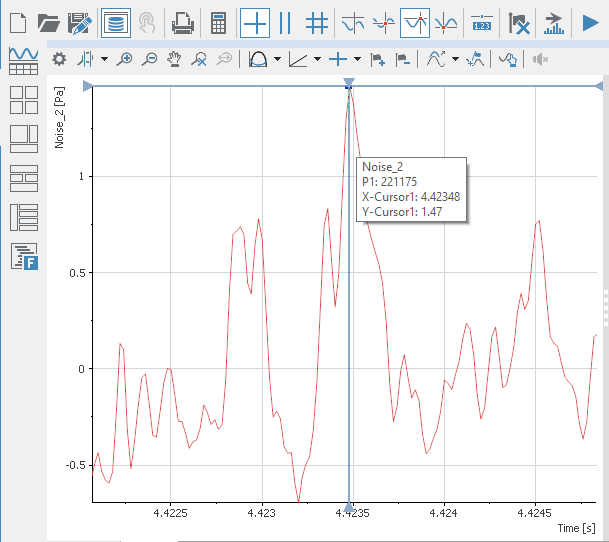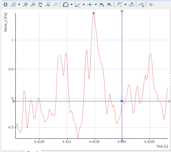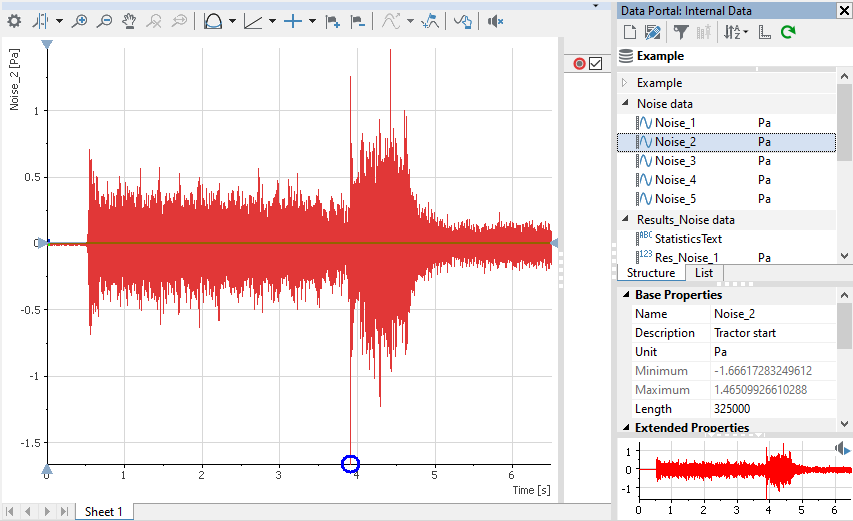 A new blank sheet will appear. From the Data Portal, collapse the 'Example' channel group and expand 'the 'Noise data' channel group by first selecting it, and then right click and choose the pop up menu option 'Collapse Groups' and 'Expand Groups'. Note that the channel data in the channel group 'Noise data' has a sine wave looking icon to the left of the channel names. These are waveform channels. Click on the 'Noise_2' channel and drag and drop it to the empty VIEW worksheet you created, choosing the '2D Axis System' pop up menu option. In the image below, a blue circle shows the spike we are going to remove.