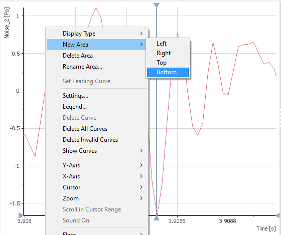 The 'Minimum Values Cursor' states that the minimum value occurs at X = 3.90846 sec, and at the position in the channel of 'P1: 195424'. That position is what DIAdem calls a 'row'. Let's look at that row for all channels in that group in a Channel Table. Right click in the 2D Axis System background and choose 'New Area' and then 'Bottom'.