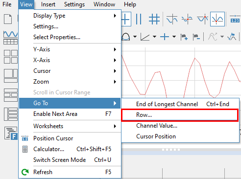 We want to delete row 'P1: 195424' at X = 3.90846 sec for all channels, so that they are the same length and will be accepted by any other analysis we may wish to perform. Click anywhere in the Channel Table to make sure it is selected and active. From the VIEW 'View' menu, choose 'Go To', 'Row...'.
