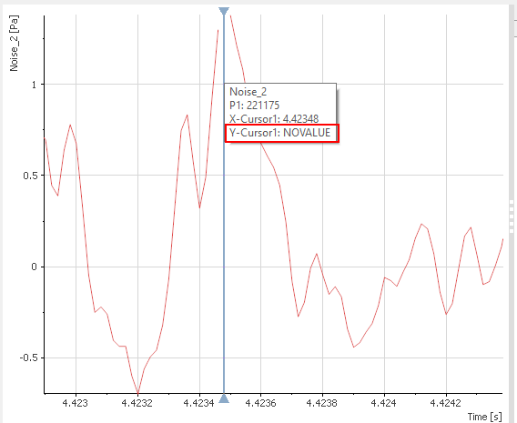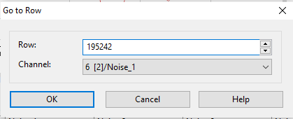 As you can see from the image above, the spike is gone, leaving a gap between the remaining points. That gap is because the value for channel 'Noise_2' at row 221175 is NOVALUE. Use the VIEW toolbar 'Curve Cursor' to see the value at the gap and confirm it is NOVALUE. If you look at the data with a Channel Table, you will see that in row 221175, channel 'Noise_2' has a value of NOVALUE. If you plan to do further analysis, a NOVALUE may cause problems, forcing you to do something with it. Now is the best time to resolve that NOVALUE.