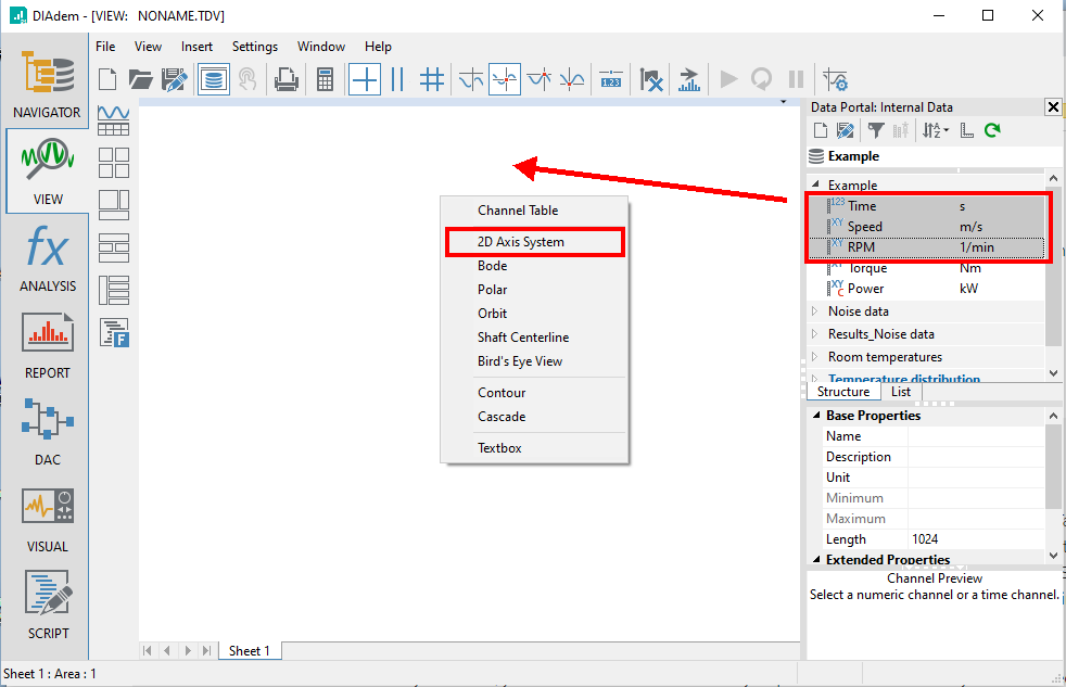 In the Data Portal, under the channel group 'Example', select the channel 'Time' and then while pressing the 'Ctrl' key, select the channels 'Speed' and 'RPM'. With the mouse still over the selected channels, drag and drop them to the upper VIEW sheet. A pop up menu will appear, select the '2D Axis System' option.
