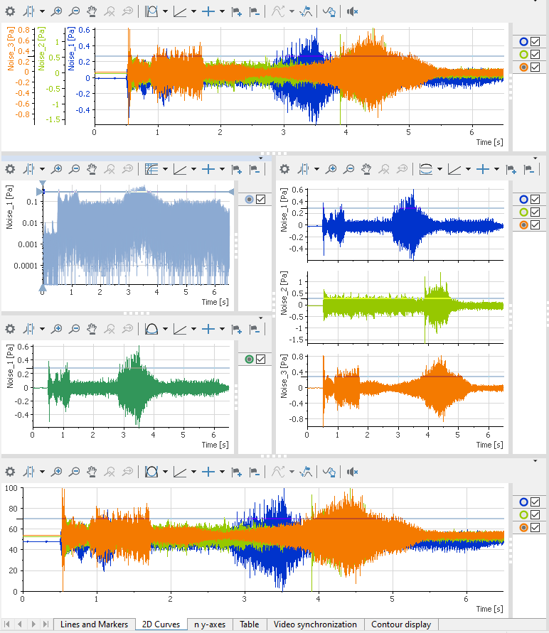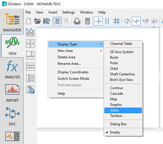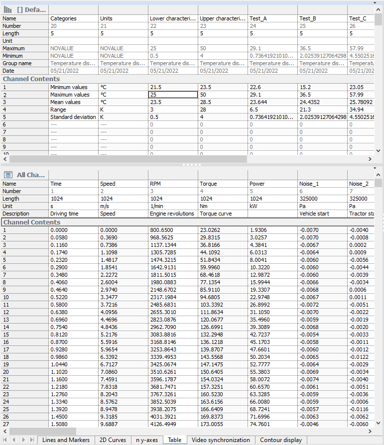 The DIAdem VIEW panel allows you to visually inspect and graphically analyze data loaded into the Data Portal. Channel Tables allow you to see the contents of channel individual values in tabular format. The 2D Axis System enables inspection of plotted channel data. The layout in VIEW is flexible, allowing you to view a channel table in one section, and one or more 2D Axis System plots in an other. Other types of interactive visualization tools are available, including Bode, Polar, Orbit, Shaft Centerline, Birds Eye View, Contour, Cascade, Map, Graphic, Video, and Textbox, depending on the type of channel you have.