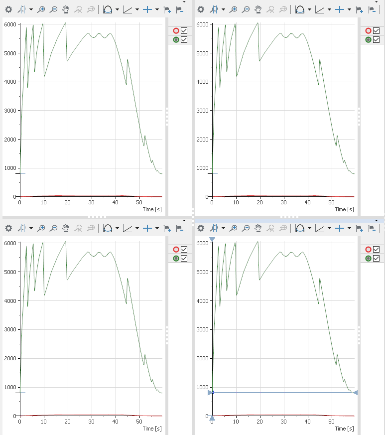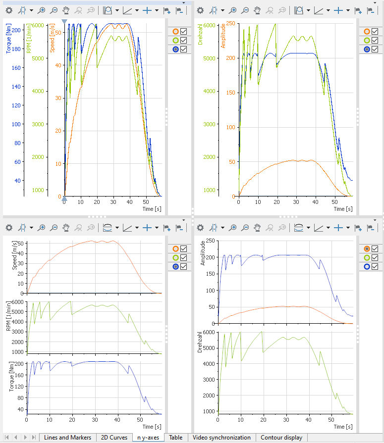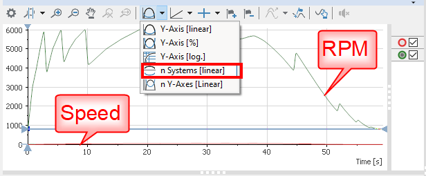 Activate the VIEW panel and create a new layout with the 'File', 'New' menu options. Choose the 'Regular Worksheet Partitions' group bar and then the option 'Four Areas'. In the Data Portal, expand the channel group 'Example', and then select the channel 'Time' first, and then the channels 'Speed' and 'RPM'. Drag and drop the three selected channels into every the VIEW sheet upper left area, and then choose the '2D Axis System' from the popup menu that appears. Repeat this for the remaining three VIEW sheet areas. Click here to see how the VIEW sheet should appear. Use the 2D Axis System 'Y-Axis' toolbar to configure the Y-Axis for each of the four VIEW sheet areas as 'n Systems [linear]'.