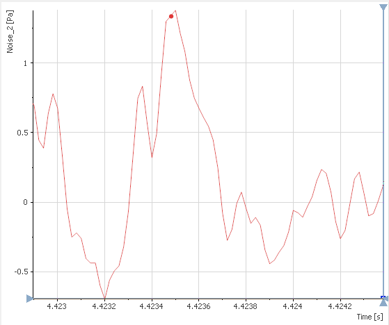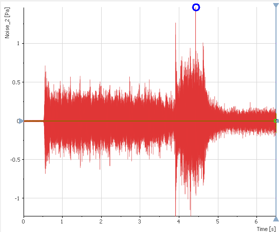 Another way to remove a spike is to do it completely from the 2D Axis System. Click the 2D Axis System 'Zoom off' option to show the entire time history for channel 'Noise_2'. We are going to graphically remove the spike highlighted with a blue circle in the image below.