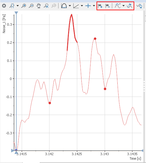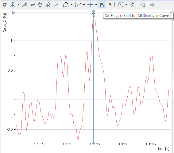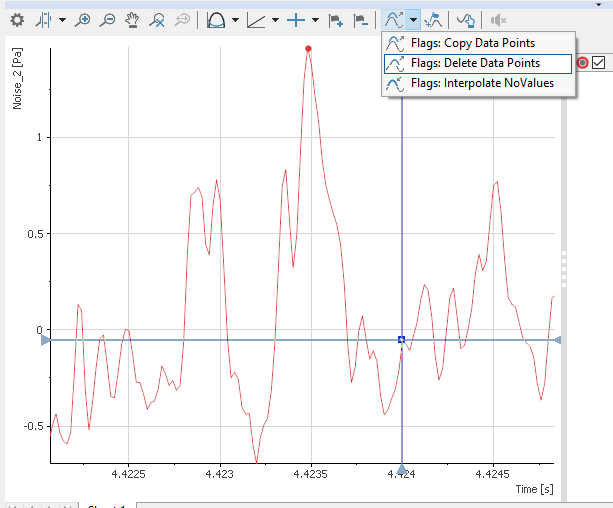 Then click on the 2D Axis System toolbar 'Flags' and choose the option 'Flags: Delete Data Points'. This will actually set the value for channel 'Noise_2' to NOVALUE (no rows will be deleted).