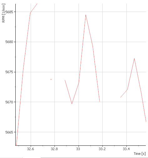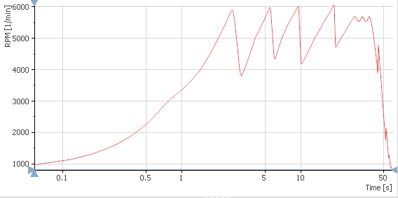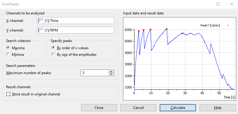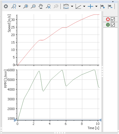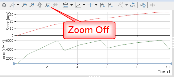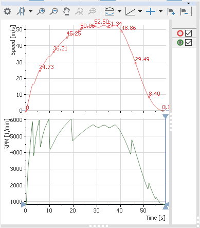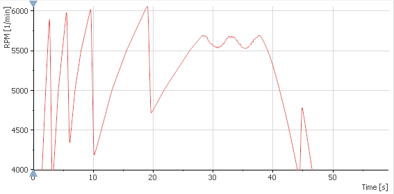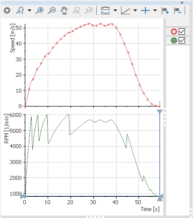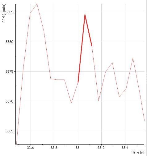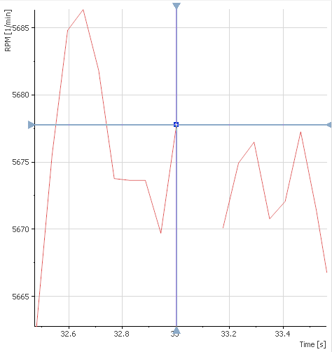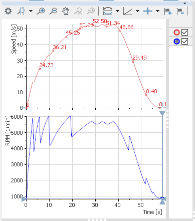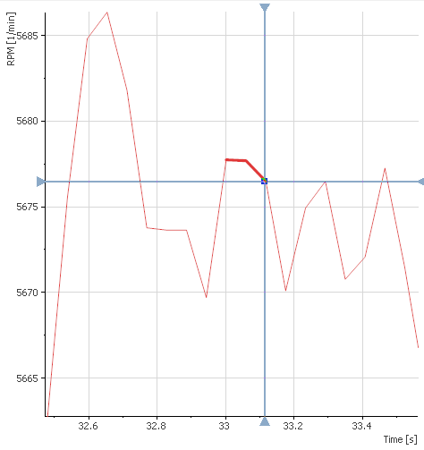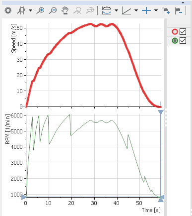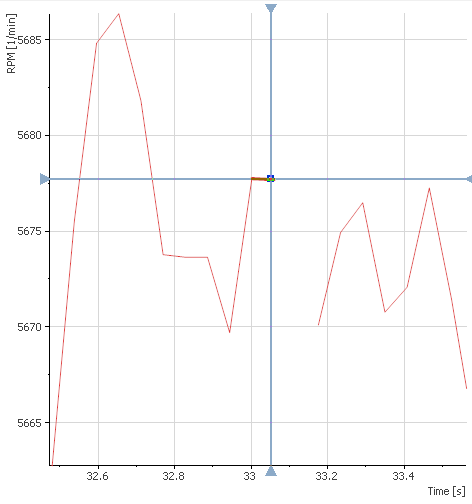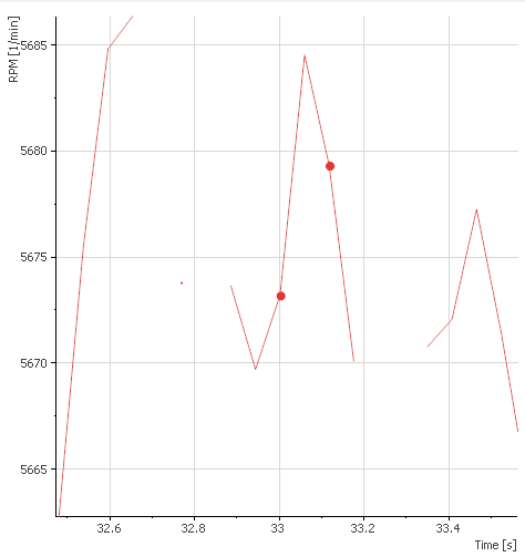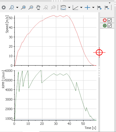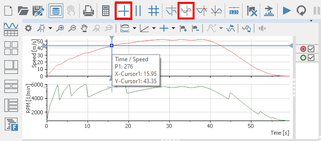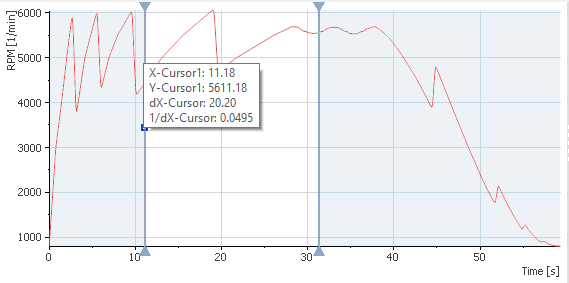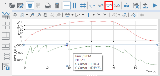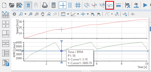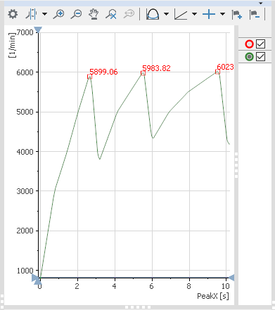 Click on the VIEW 'Maximum Values Cursor' toolbar, and then click on the RPM curve and drag from left to right, observing how the cursor jumps from one discovered peak to the next, displaying the X and Y channels values in a small windows.