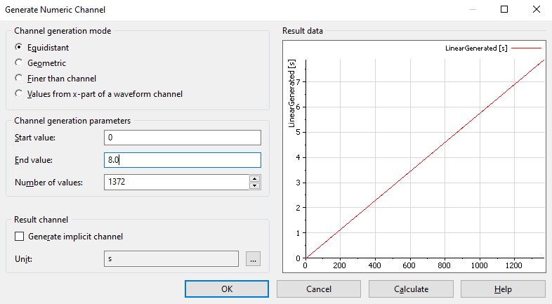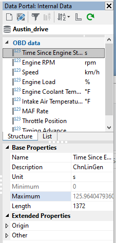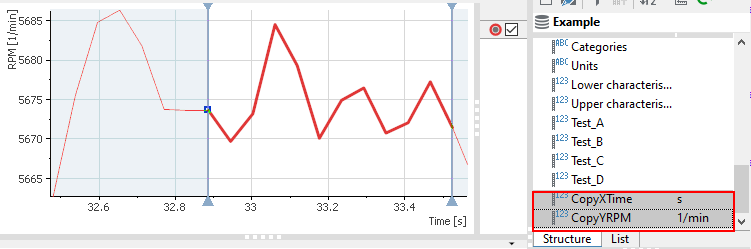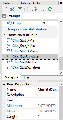 Click on the 'Save Values' button in the dialog. In the Data Portal, you will find a new channel group named 'StatisticResultGroup' with channels created containing the values from the dialog. Note that when descriptive statistics are calculated for all values in a channel, DIAdem by default adds those values as properties to the channel analyzed. But in this case only a portion of the channel was added, and therefore it was necessary to create channels that identify the range of values analyzed, and the results.