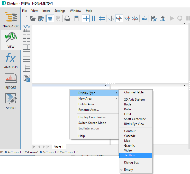 Click in the center of the VIEW sheet lower left area, right click and choose the option 'Display Type', 'Textbox'.