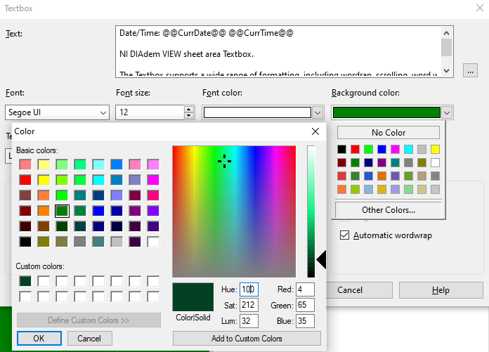 oTextbox.Text = oTextbox.Text & "The background color shown here is RGB(4,65,35)" & vbCrLf & vbCrLf