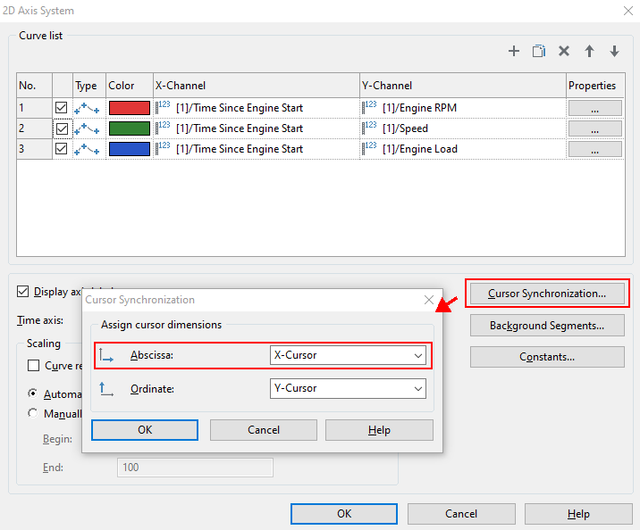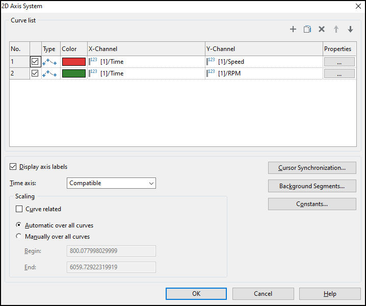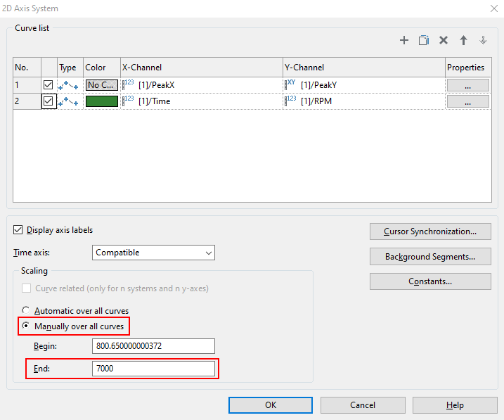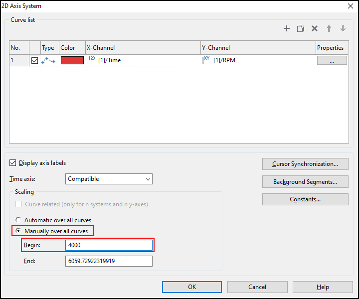 Open the '2D Axis System' dialog by double clicking in the center of the 2D Axis System in the upper VIEW area, or right click and choose the popup menu option 'Settings...'. In the lower section of the '2D Axis System' dialog, change the 'Scaling' option from to 'Manually over all curves'. Note that the 'Scaling' is relative to the Y-axis, or the channel 'RPM'. The 'Begin:' and 'End:' limits should be set to the minimum and maximum values of the channel 'RPM', respectively. Change the 'Begin:' to '4000.0' and then click the 'OK' button to accept the change and close the dialog.