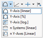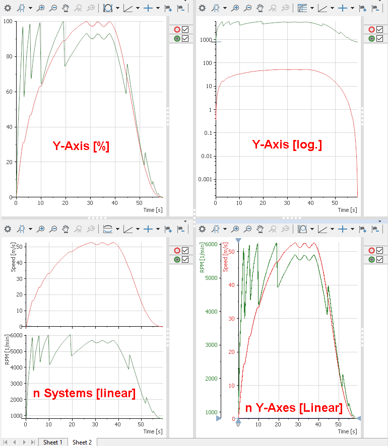 In the VIEW sheet top left area, select the 2D Axis System toolbar option 'Y-Axis', and then the option 'Y-Axis[%]'. In the VIEW sheet top right area, select the 2D Axis System toolbar option 'Y-Axis', and then the option 'Y-Axis[log.]'. In the VIEW sheet bottom left area, select the 2D Axis System toolbar option 'Y-Axis', and then the option 'n Systems[linear]'. In the VIEW sheet bottom right area, select the 2D Axis System toolbar option 'Y-Axis', and then the option 'n Y-Axes [Linear]'.